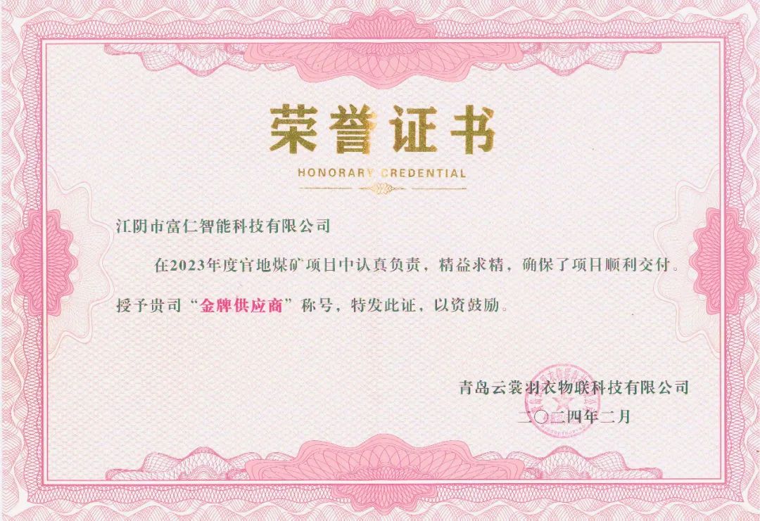 2024年春節(jié)前夕,富仁智能被青島云裳羽衣物聯(lián)科技有限公司授予“2023年度金牌供應(yīng)商”這一榮譽(yù),這是海爾衣聯(lián)網(wǎng)對(duì)供應(yīng)商伙伴的高度肯定!至此,富仁智能的農(nóng)歷癸卯年完美收官。