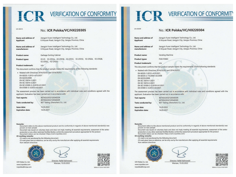 今年3月,富仁智能又迎喜訊,經層層檢驗,富仁智能順利取得了由波蘭ICR Polska認證機構頒布的智能垃圾箱及售賣柜CE證書。眾所周知,歐盟CE認證一向以高標準、嚴要求著稱,不論是歐盟內部企業生產的產品,還是其他國家生產的產品,在歐盟市場上自由流通的前提必須是產品符合歐盟《技術協調與標準化新方法》指令的基本要求。富仁智能獲此認可,標志著其產品在品質性、安全性、健康性上獲得了歐美市場的肯定,為進軍國際市場奠定了堅實基礎。