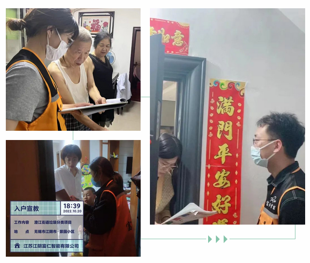 在項目落地初期,為打消居民對垃圾房臟亂差的固有印象,支持“三定一督”分類屋的建設工作,通過入戶宣傳的方式,富仁智能向該小區每一戶居民宣貫垃圾分類對江陰城市更新項目的重要性,并廣泛征求居民對垃圾分類屋建設的意見和建議,確保垃圾分類屋點位選址合情合理。同時還向居民發放了《生活垃圾分類投放指南》,充分說明“三定一督”垃圾分類運營模式,為后期的督導運營工作做鋪墊。